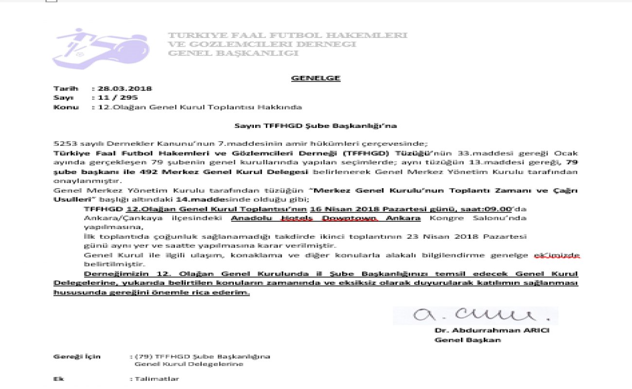 12.Olağan Genel Kurul Toplantısı hakkında gerekli bilgiler TFFHGD Genel Merkezi tarafından ekte bulunan dosyada açıklanmıştır. Bilgilerinize sunarız.